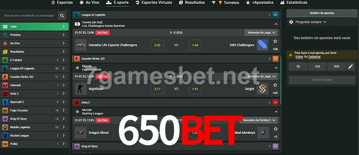 O 650Bet oferece uma grande seleção de opções de apostas em e-sports com probabilidades competitivas